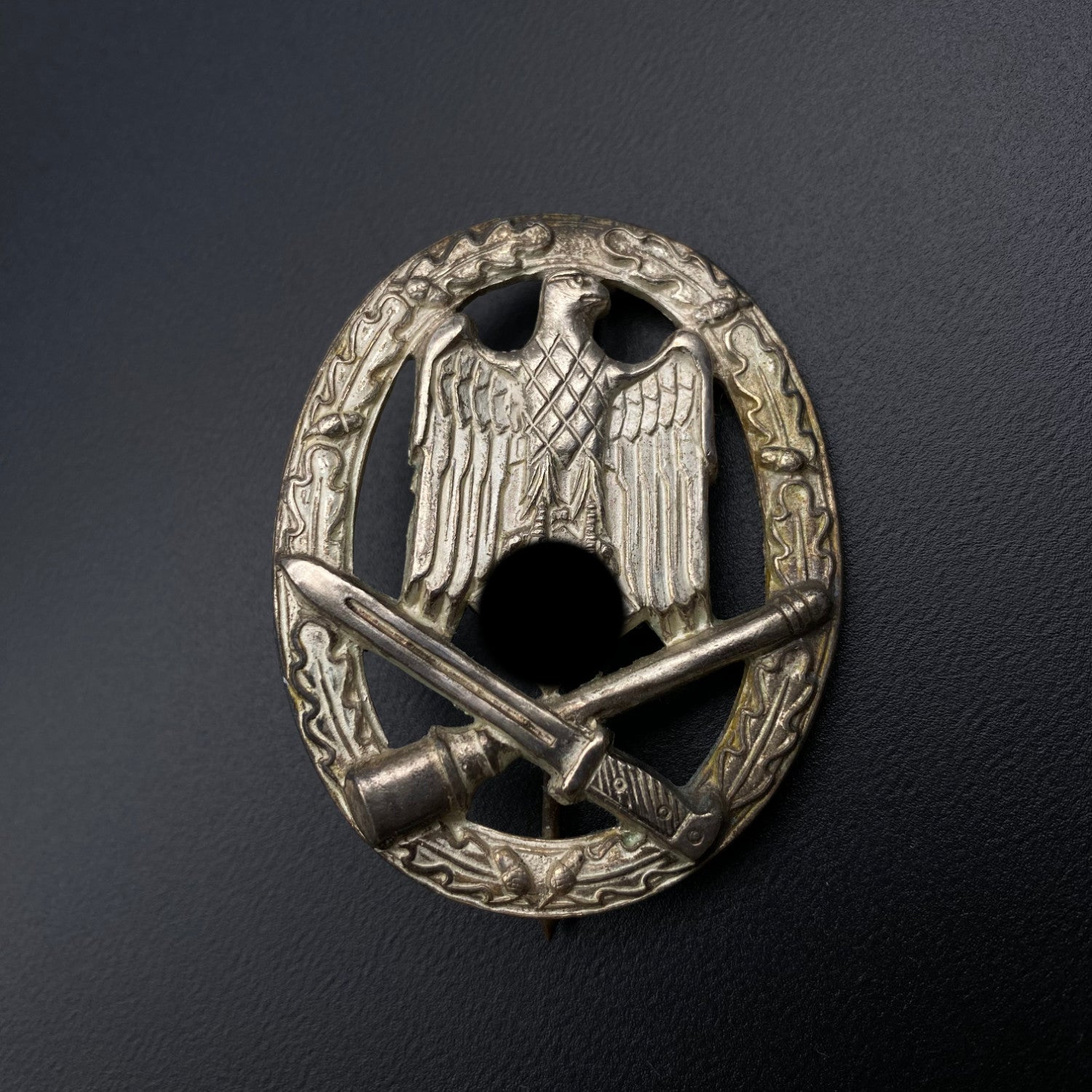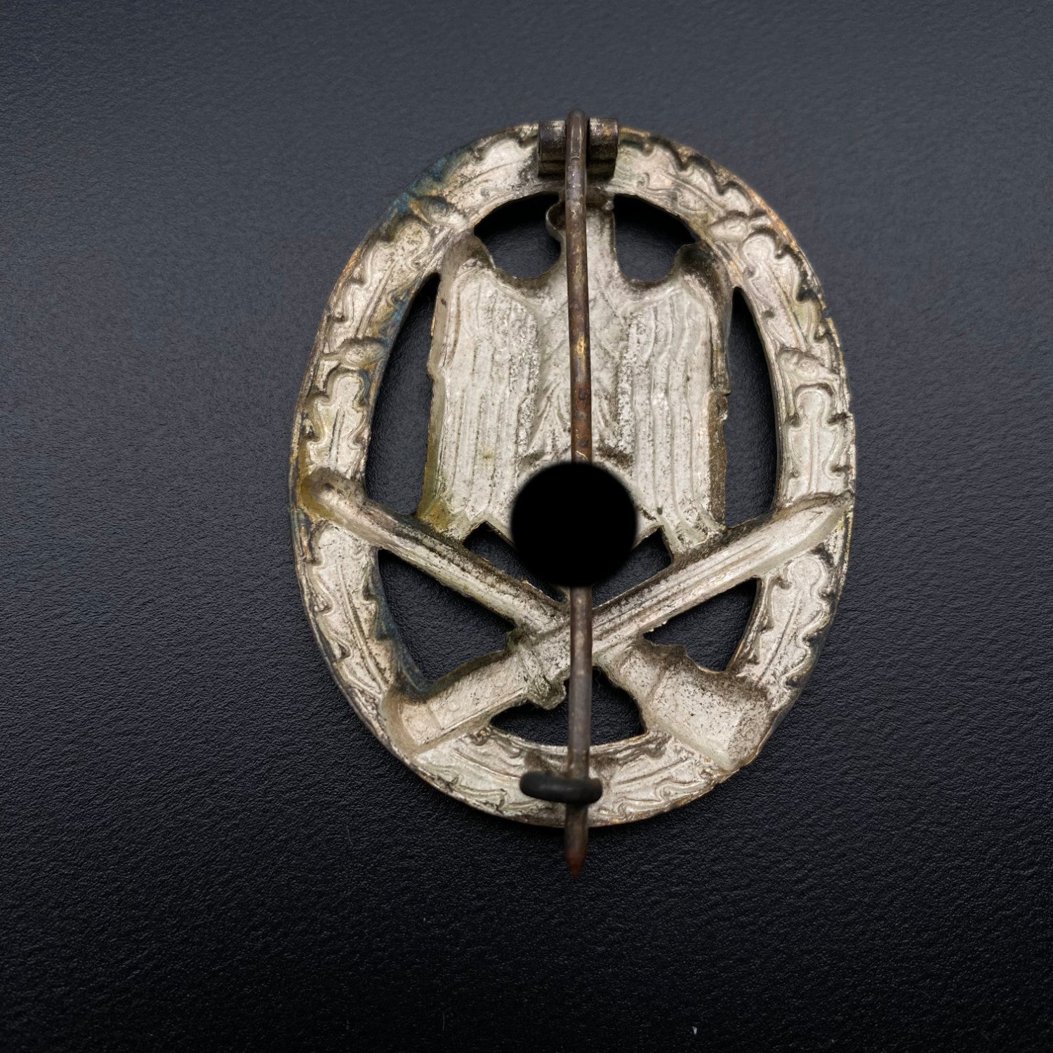 Very rare and desirable early General Assault Badge made by Hymmen, Lüdenscheid. Frosty silver finish, perfect condition. Early tombak made specimen. Very rare piece!