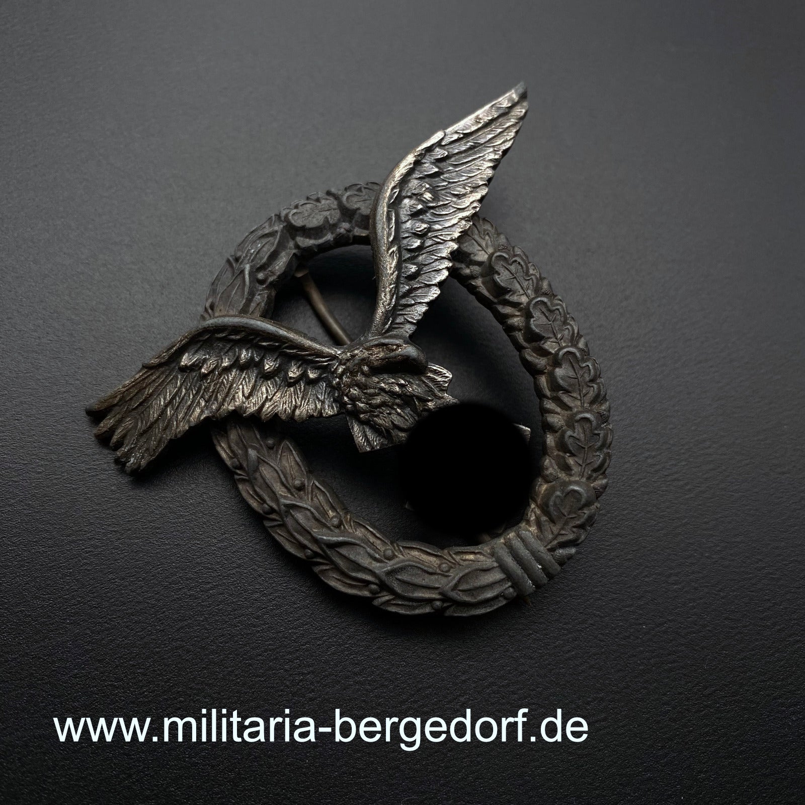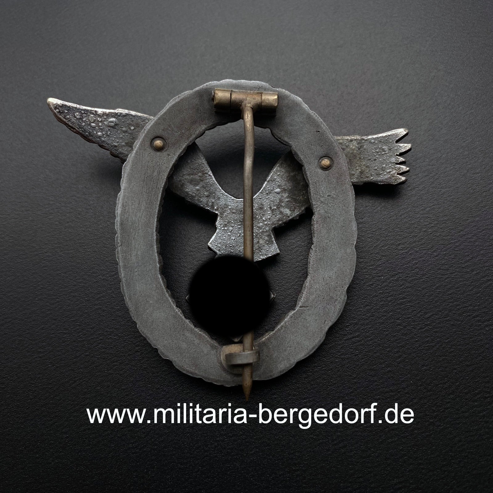 Sehr schönes Flugzeugführerabzeichen in Zink. Getragenes, unmarkiertes Stück des Herstellers C.E. Juncker, Berlin. Eine Kopie der Besitzurkunde (Jagdflieger auf BF 109!) wird dem Käufer zur Verfügung gestellt.