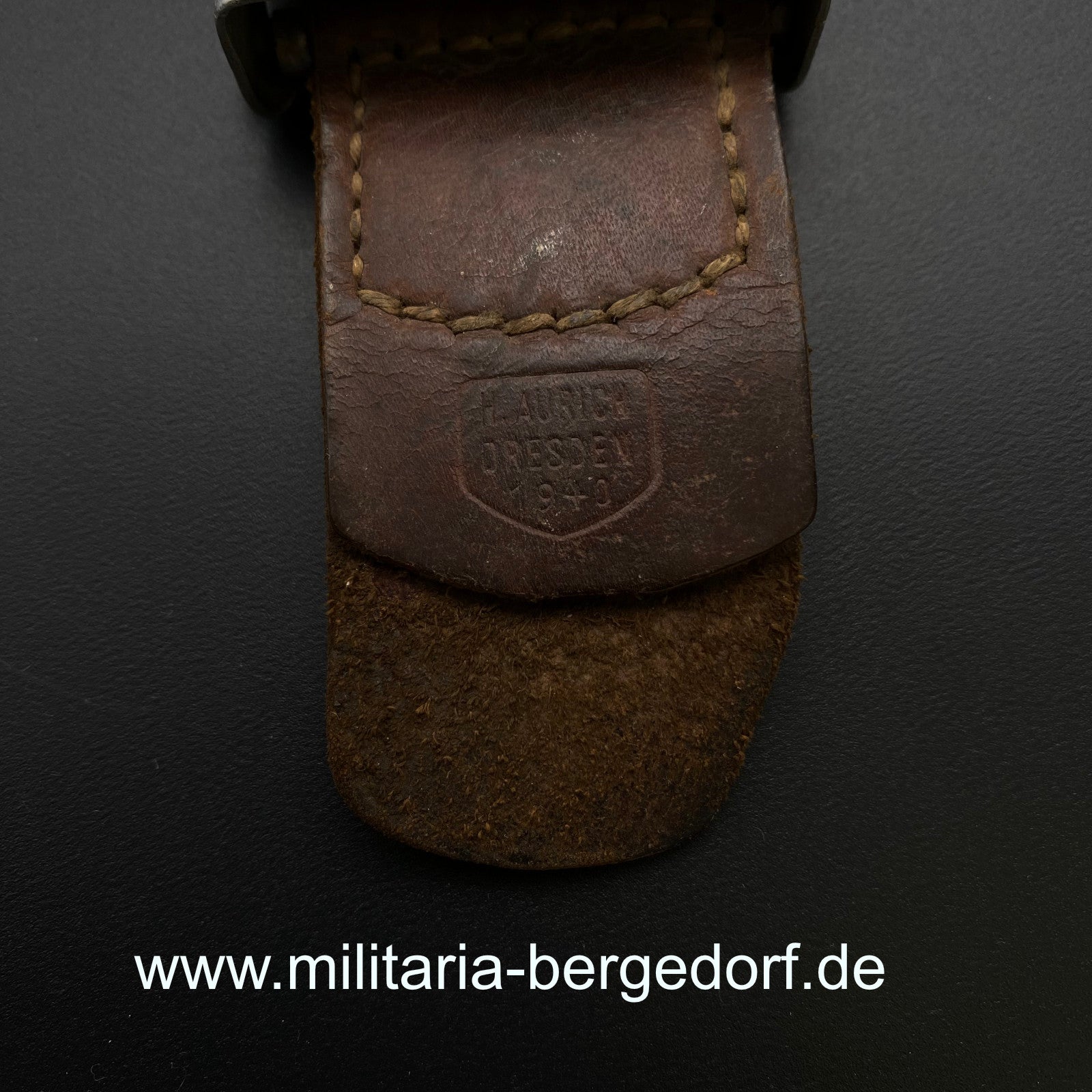 Early buckle for the Luftwaffe. Aluminium (HA 39) with leather attachment. Stamped "Aurich 1940". Very nice, slightly worn condition.