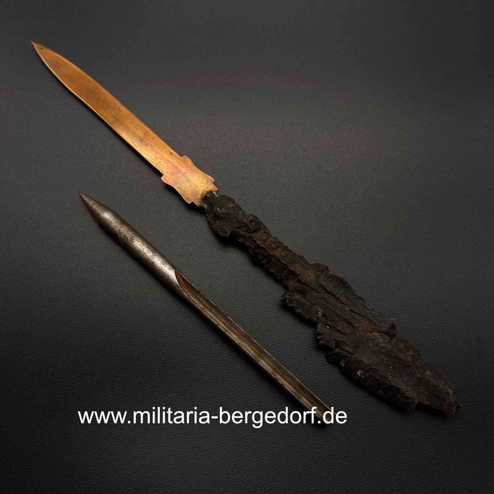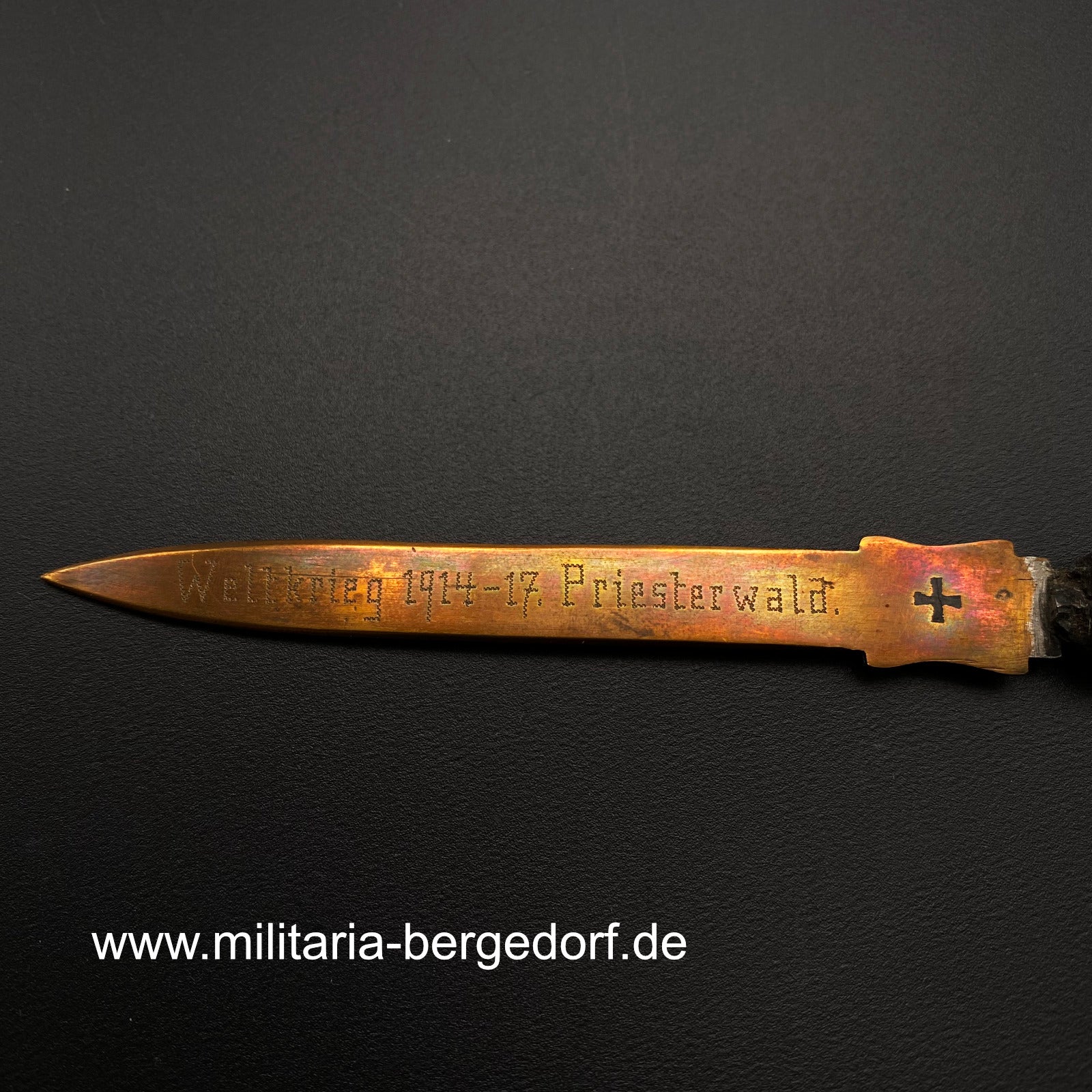 Kleiner Grabennachlass des 1. Weltkrieges bestehend aus sog. Grabenkunst und einem deutschen Fliegerpfeil. Der Brieföffner sehr hochwertig gefertigt aus einer Granathülse und einem franz. Schrapnell. Die Klinge ganz fein und wunderschön graviert mit "Weltkrieg 1914-17. Priesterwald." und Balkenkreuz. Eines der schönsten Stücke an Grabenkunst, welche ich erwerben konnte. Dazu ein sog. stählerner Fliegerpfeil aus deutscher Fertigung. Extrem seltene und gesuchte Memorabilia des ersten Weltkrieges!