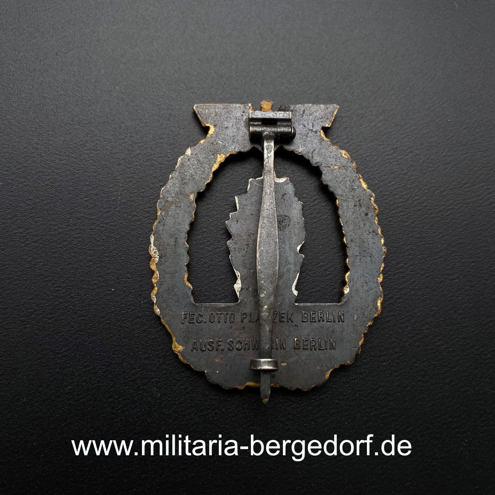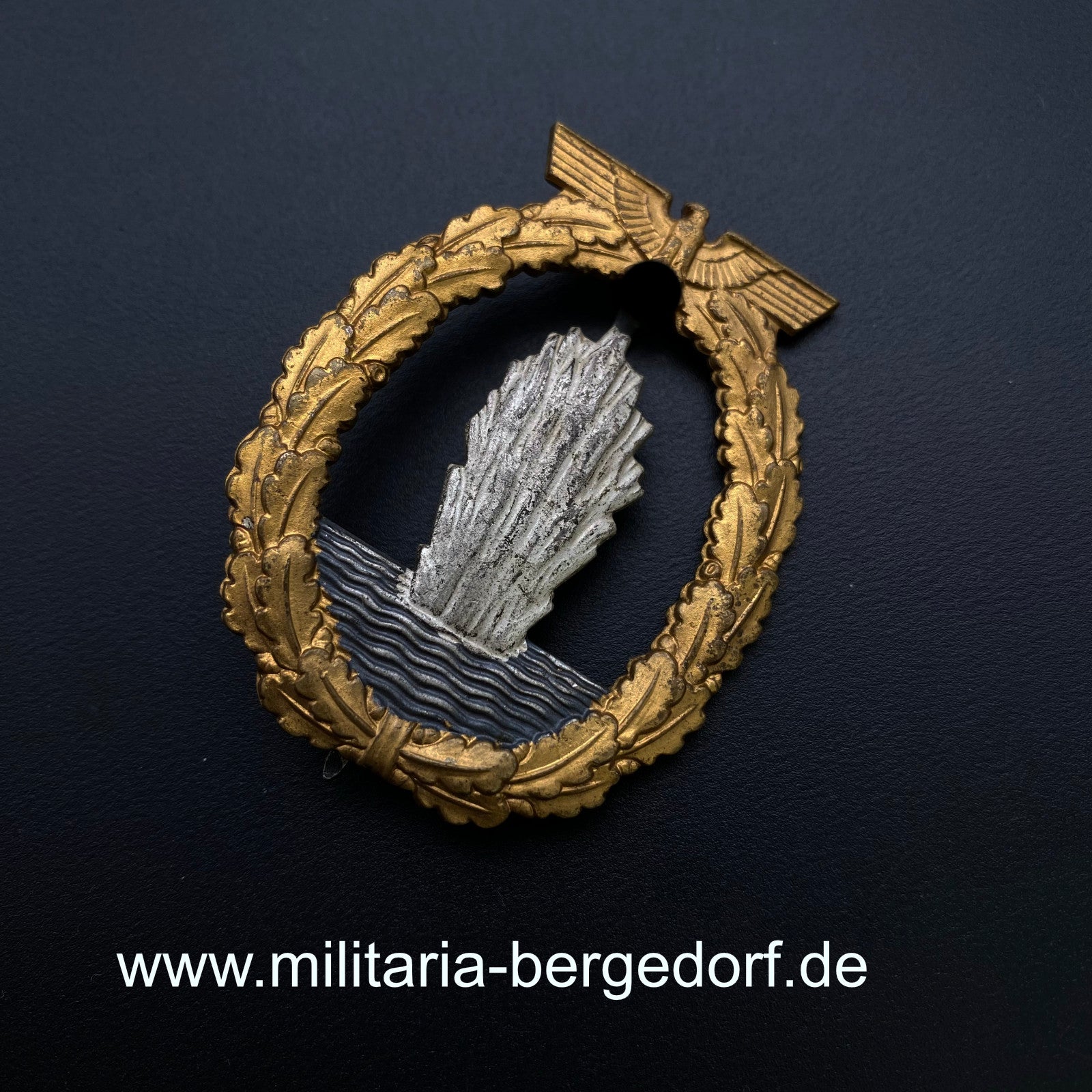 Unworn, mint minesweeper badge with only slight traces of storage maker marked "Schwerin, Berlin". Glowing fire gilding, fontaine nicely silvered, the back fully blued. A very early tombak made piece. Extremely rare and desirable piece in superb condition. In many years the first piece in such pristine quality I am able to offer.