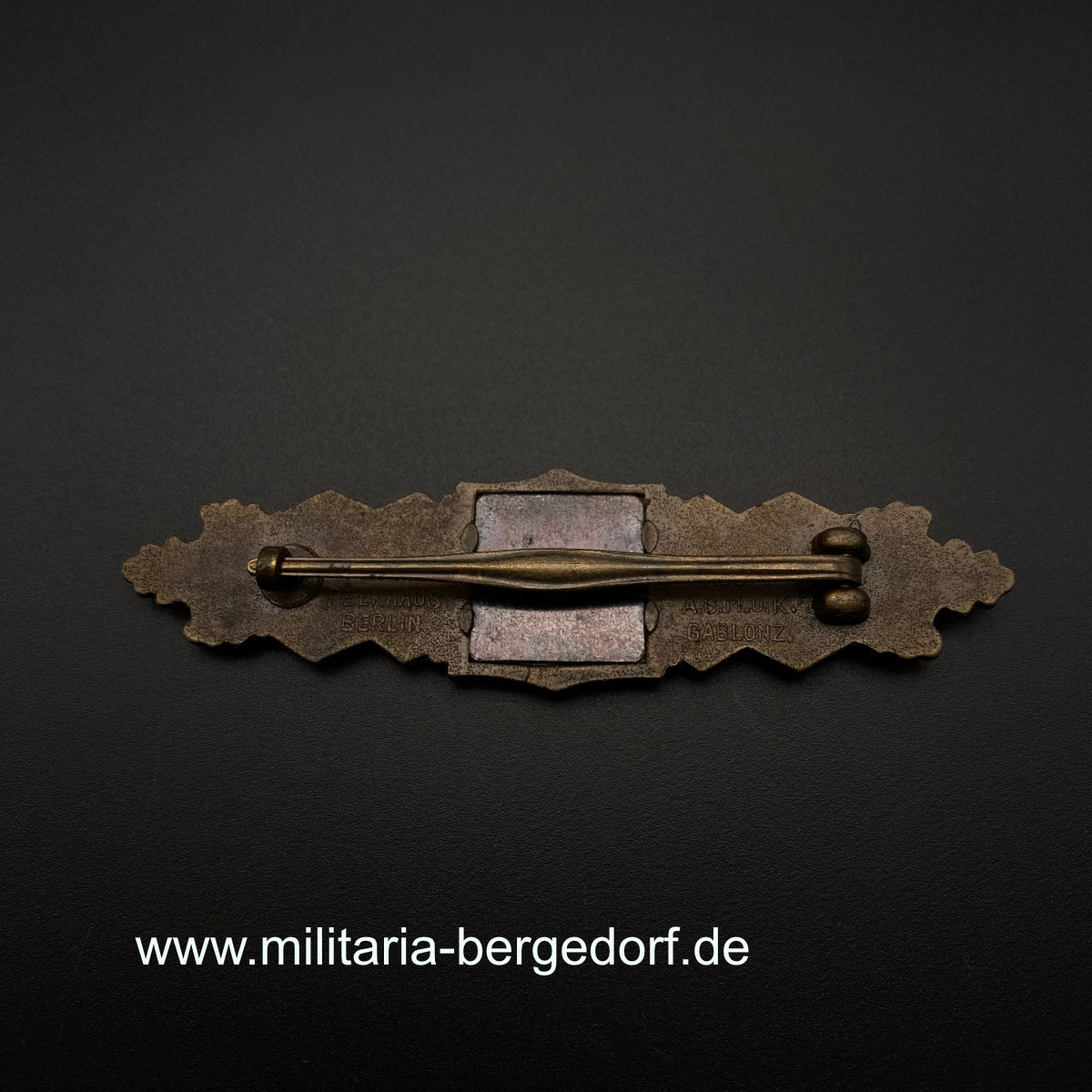 Extremely rare and desirable Close Combat Clasp in bronze, maker marked "AGMuK". Unworn piece with stunning bronzing. in this condition extremely hard to find. Please note the typical crach near the bayo.