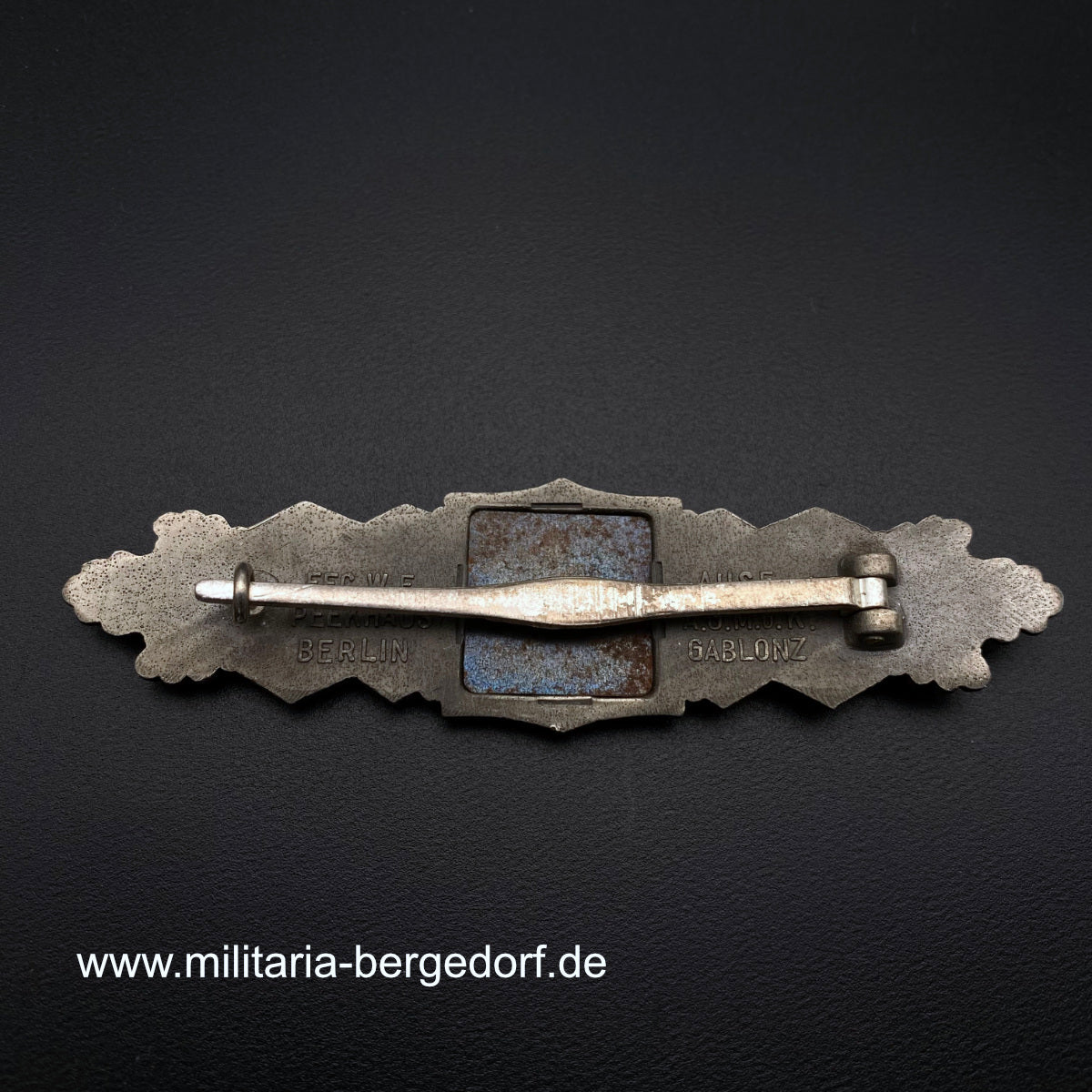 Sehr schöne Nahkampfspange in silber des Herstellers AGMuK. Leicht getragenes Original mit dem seltenen und gesuchten gebläuten Plättchen, dies magnetisch.
