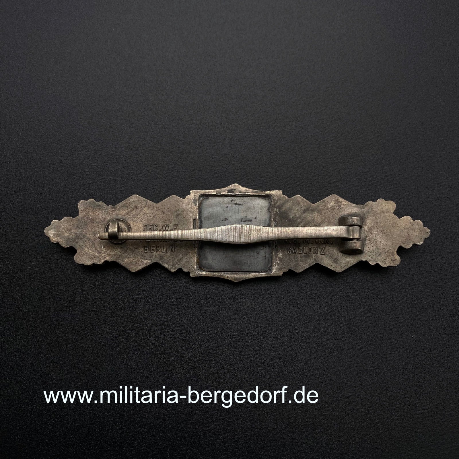 Sehr seltene Nahkampfspange in silber des Herstellers AGMuK, Gablonz. Gesuchtes Stück in herausragender Erhaltung mit nur leichten Lagerspuren und einem sehr schönen, frostigen Finish. In diesem Zustand nur sehr schwer zu finden.