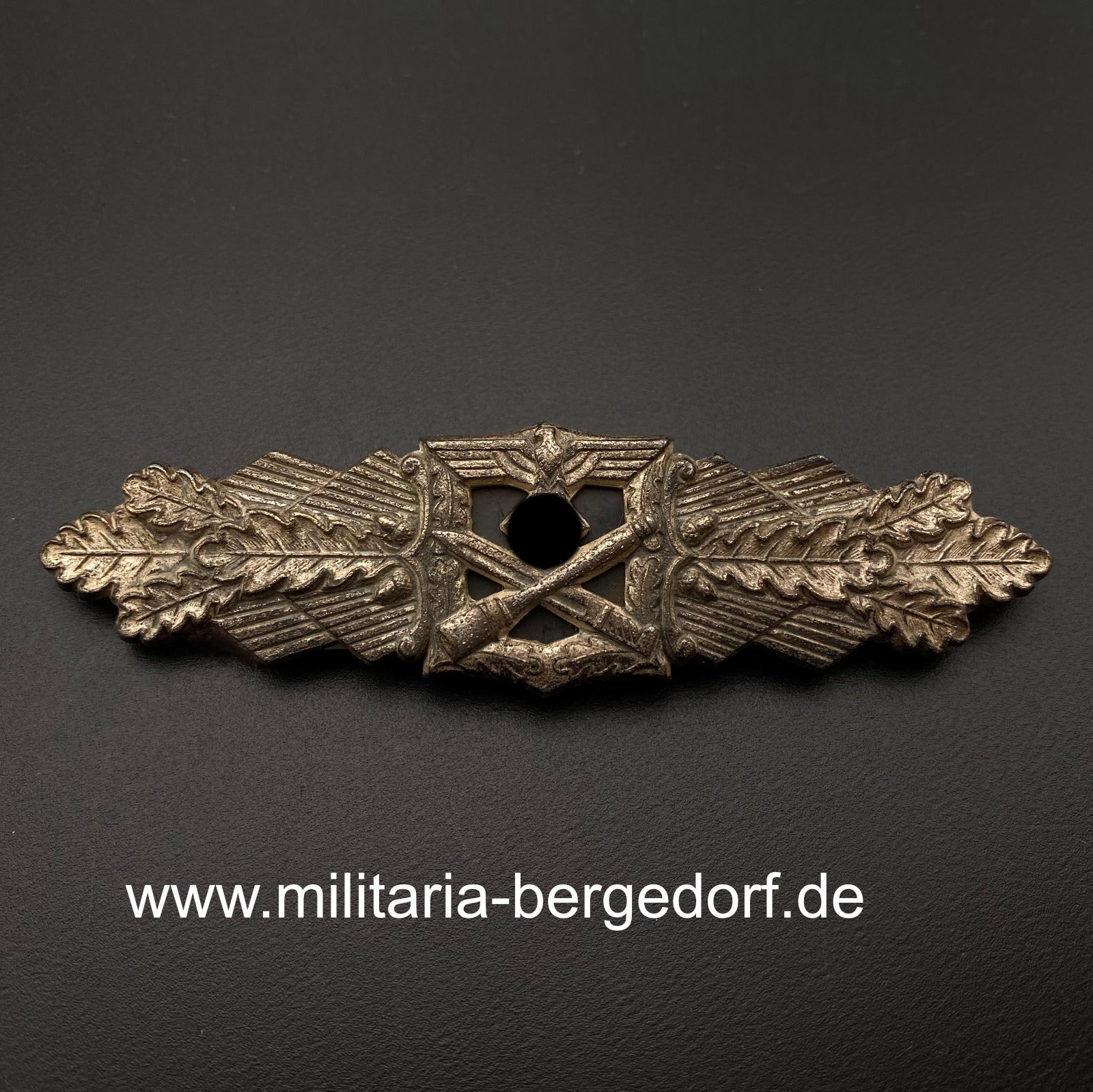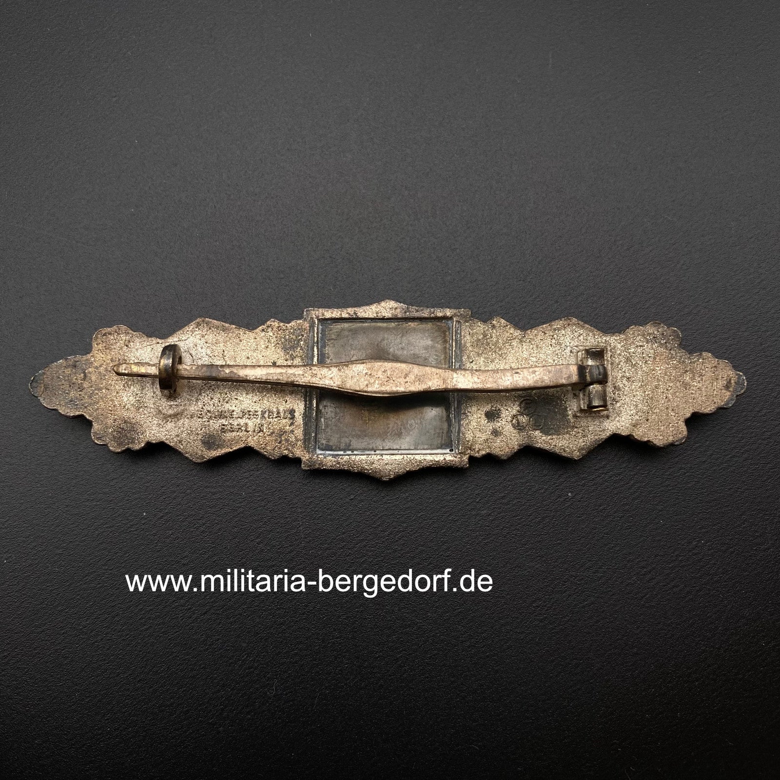 Nahkampfspange silber des Herstellers Friedrich Linden, Lüdenscheid. Außerordentlich erhaltene Silberstufe in einem perfekten, ungetragenen Zustand und beinahe vollständiger, frostier Versilberung. In diesem Zustand extrem selten und eine Bereicherung für jede Sammlung.
