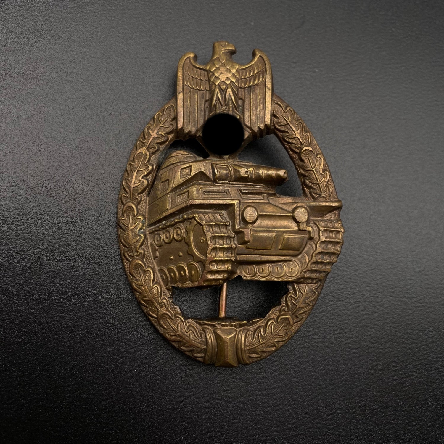 Extrem seltenes, ganz frühes Panzerkampfabzeichen in bronze des Herstellers Schauerte & Höhfeld. Sog. Cut-Out Variante in Buntmetall. In dieser Ausführung so gut wie nie am Sammlermarkt anzutreffen.