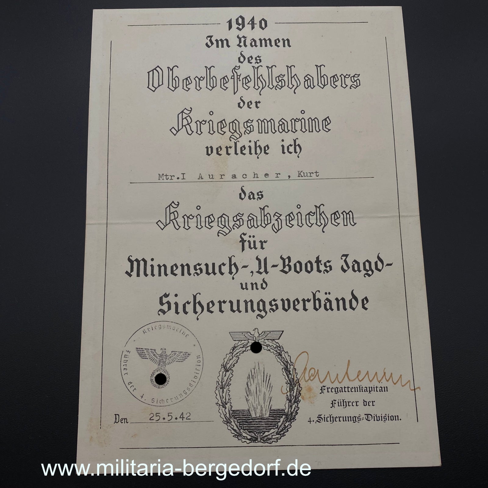 Sehr schöne, frühe Urkunde für das Minensucherkriegsabzeichen. Seltenes Stück!