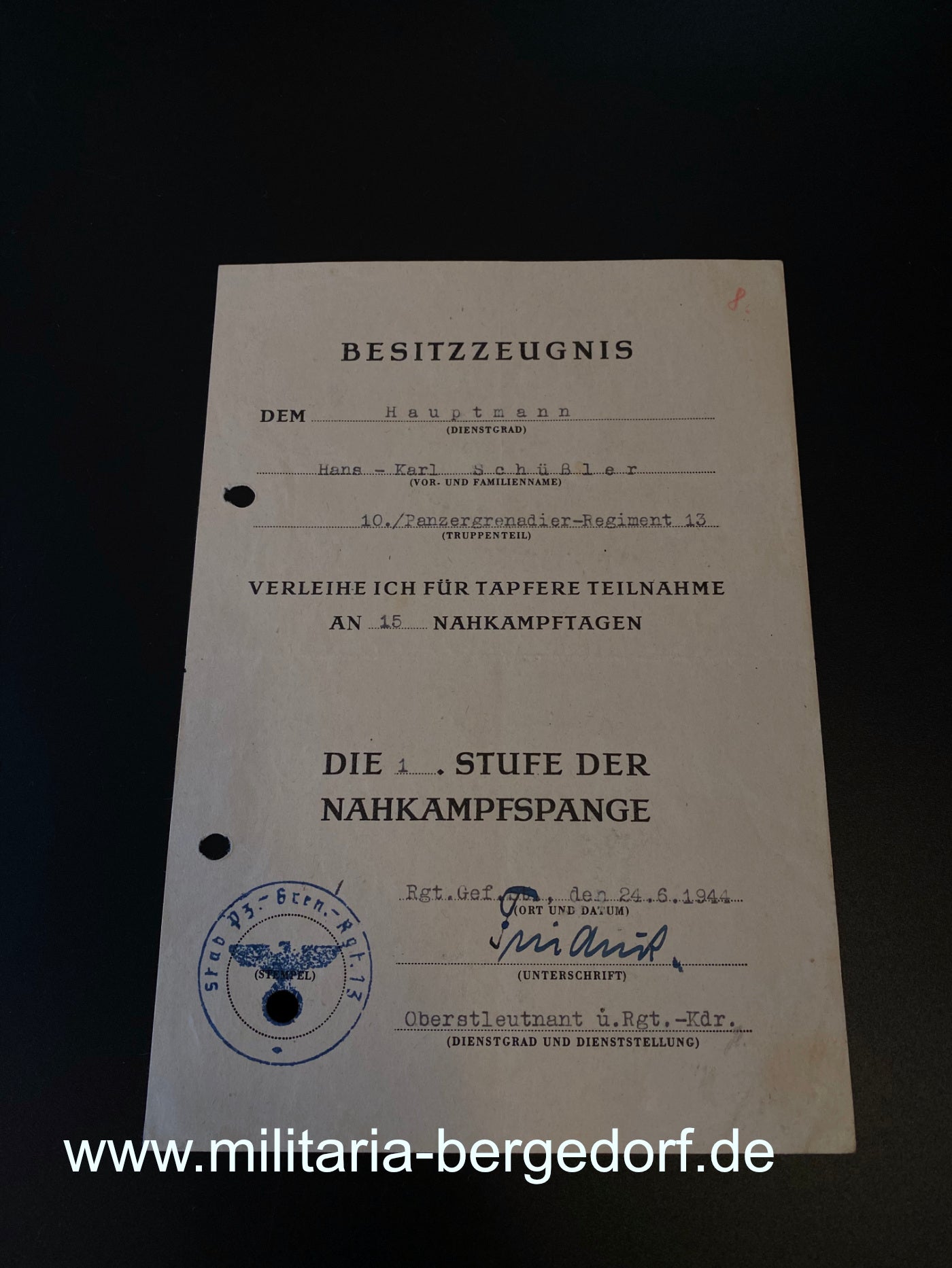 Seltene Urkunde zur Nahkampfspange in bronze. Schöner Zustand!