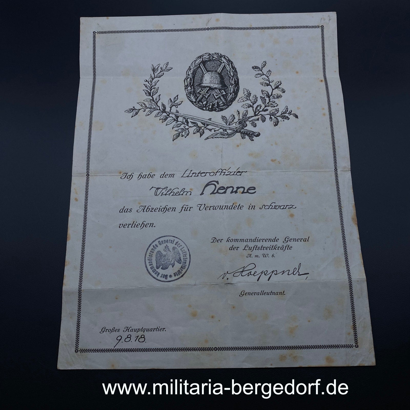 Very rare set to the black wound badge in black. Very rare award doc, awarded in the last weeks of the war. The award doc is for an nco of the imperial luftwaffe. The wound badge is a near mint, unworn piece in stunning condition.