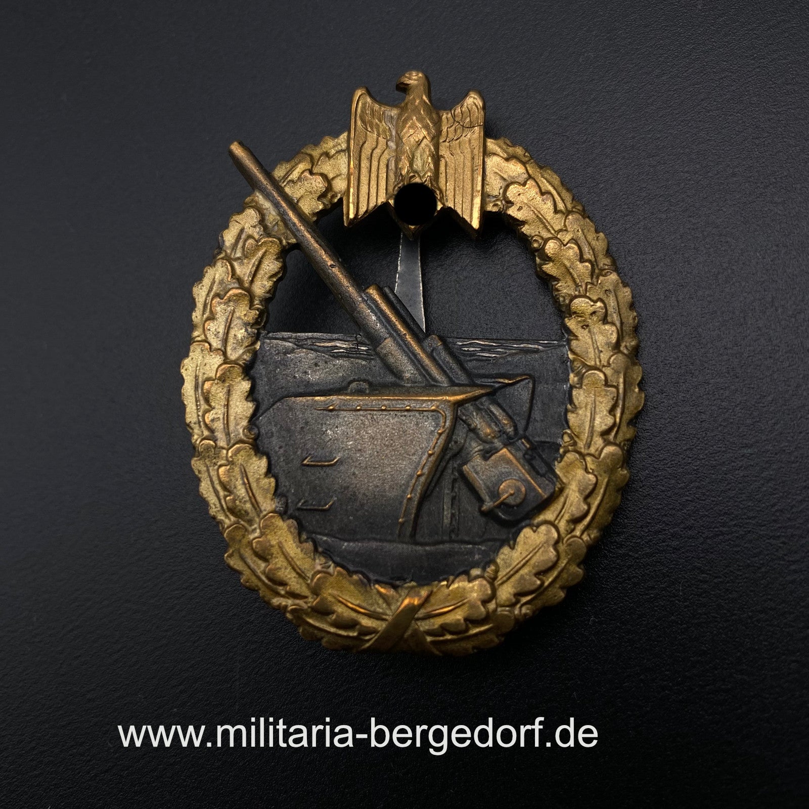 Seltenes Kriegsabzeichen der Marineartillerie. Hersteller Juncker Berlin. Ungetragenes Prunkstück mit leuchtender Feuervergoldung. Das Geschütz vollständig brüniert. Die Rückseite ebenfalls wunderschön vergoldet. Das schönste Kriegsabzeichen der Marineartillerie, welches ich in 20 Jahren gesehen habe und ein Highlight für jede KM-Sammlung!