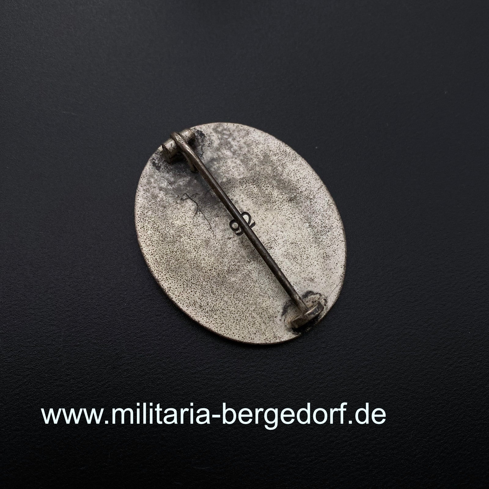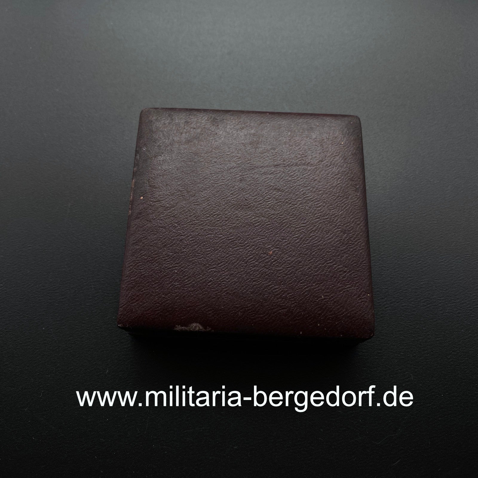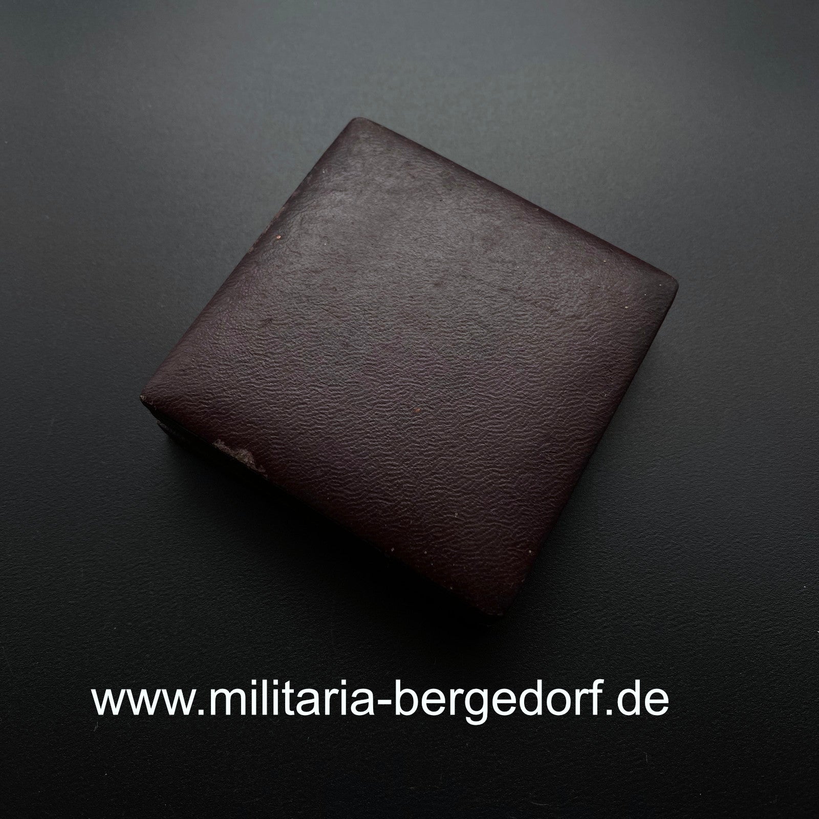 Sehr schönes Set zum VWA in silber im weinroten, sehr gesuchten LDO-Etui. Das ungetragene Zink Abzeichen in einem wunderschönen Zustand, mit leuchtender Versilberung. Herstellermarkierung "92" für Rückert, Gablonz. Das Etui nur mit leichten Lagerspuren. Wunderschönes, seltenes Set!