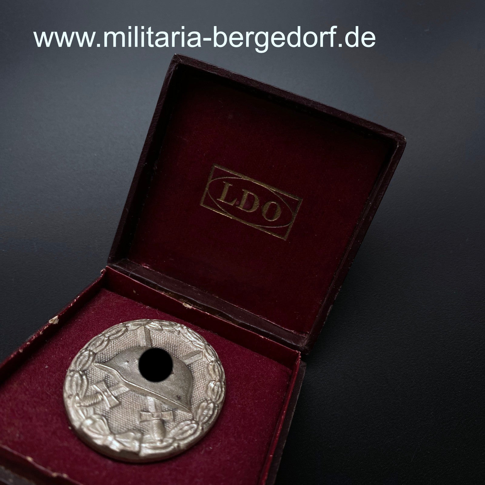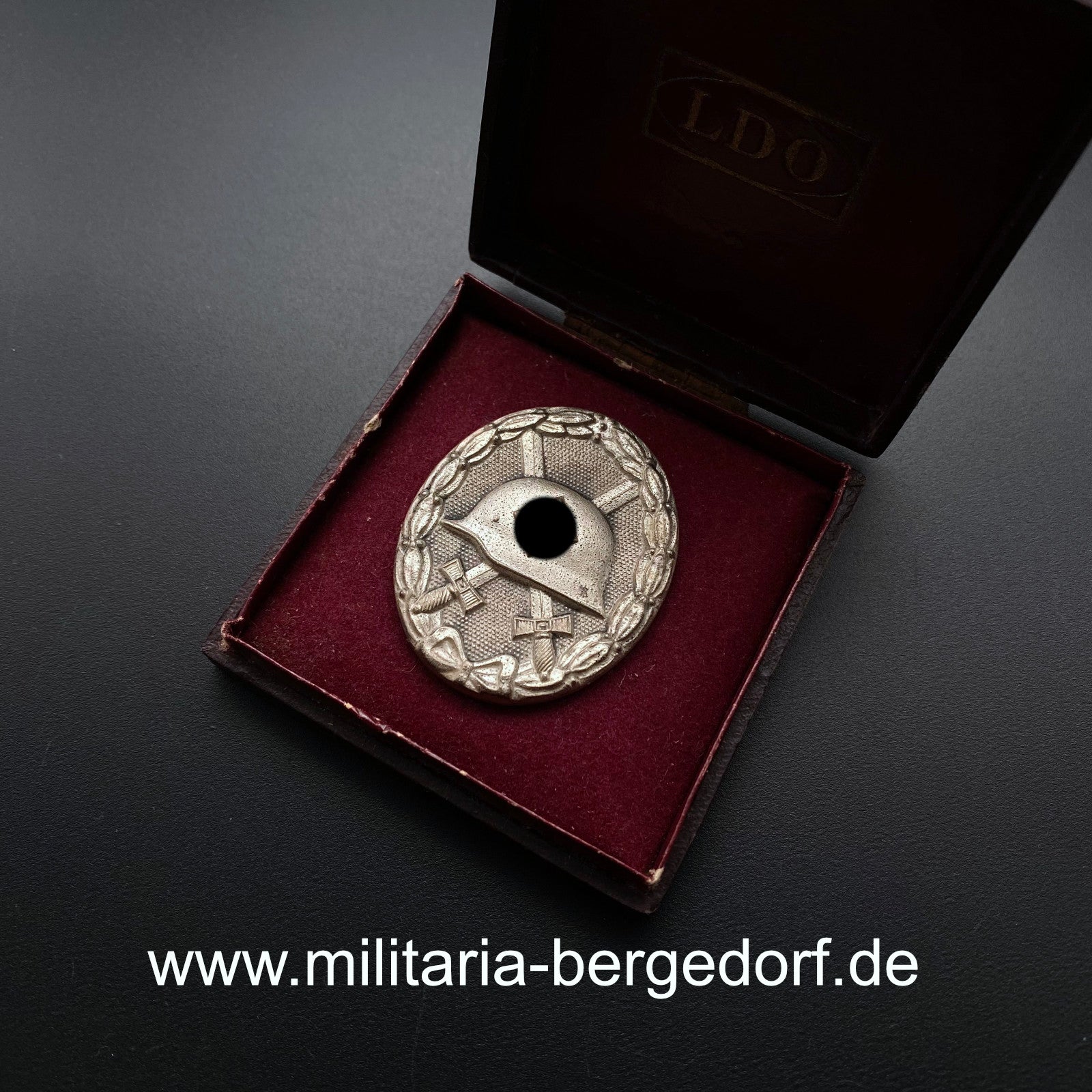 Very nice set to the wound badge in silver. Comes with the rare red LDO case and a near mint wound badge maker marked "92" for Rückert, Gablonz. The wound badge in superb condition with glowing silvering. The case with minor traces of storage. Superb set, which is very desirable.